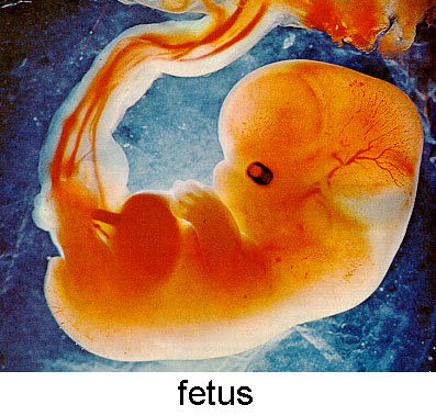 n.胎兒 [The unborn young of a viviparous(胎生的) vertebrate(脊椎動物) having a basic structural resemblance to the adult animal.]