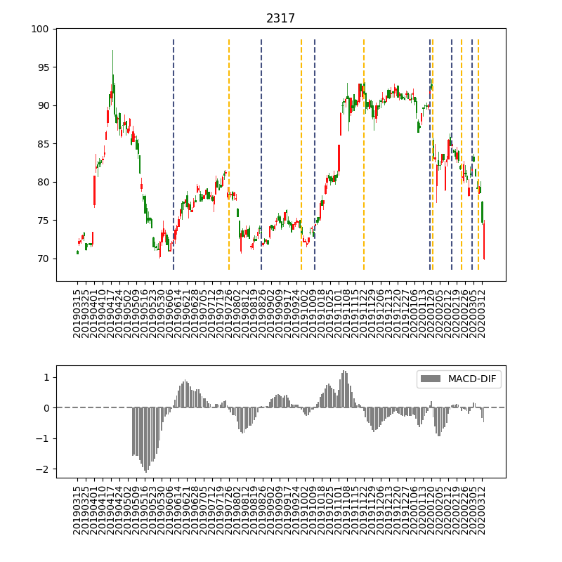 2019-06-11: close = 72.40 2019-06-17: close = 76.40, (days= 6), reward rate >= 0.05 2019-08-23: close = 73.30 2019-10-17: close = 77.20, (days= 55), reward rate >= 0.05 2019-10-14: close = 74.50 2019-10-22: close = 79.50, (days= 8), reward rate >= 0.05 2020-01-17: close = 92.30 NO results yet... 2020-02-14: close = 84.90 NO results yet... 2020-03-04: close = 81.70 NO results yet...