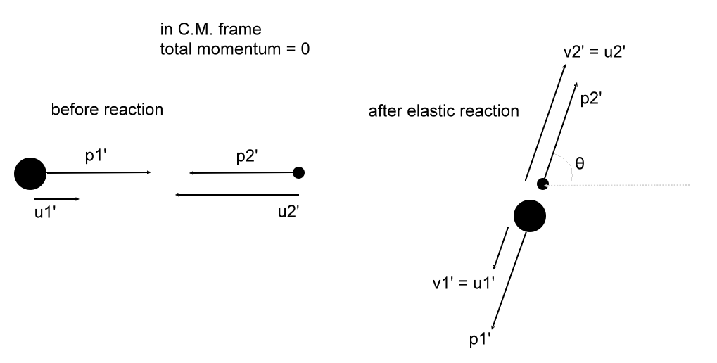 - In the C.M. frame each particle's magnitude of velocity does not change before and after reaction: