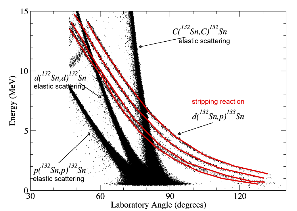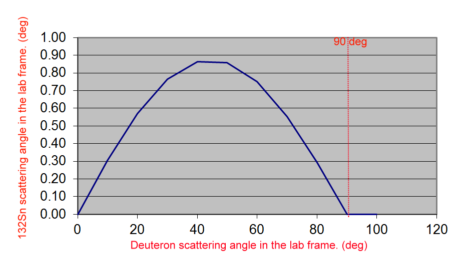 After the elastic scattering, no mass changes; the recoil is 132Sn, and the ejectile is also deuteron, and there is no excitation for both particles; Q-value =0. In the lab reference frame, the recoil of 132Sn has very small deviation off the beam axis. Its max scattering angle in the lab frame (ψ) is less than 1 deg.