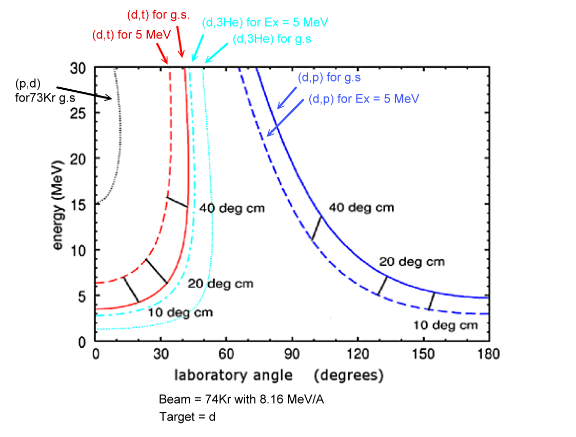 - stripping reaction, such as (d,p), mass of the light particle is halved after the reaction.