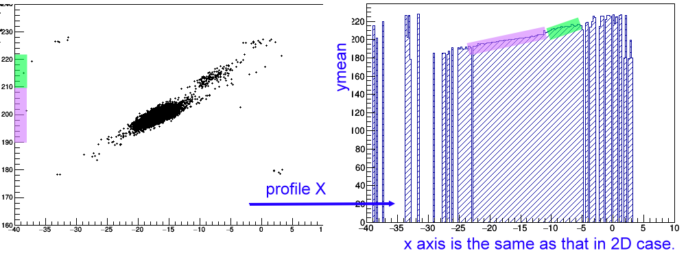 | profile x | to create a profile histogram with its counts are the y mean. |