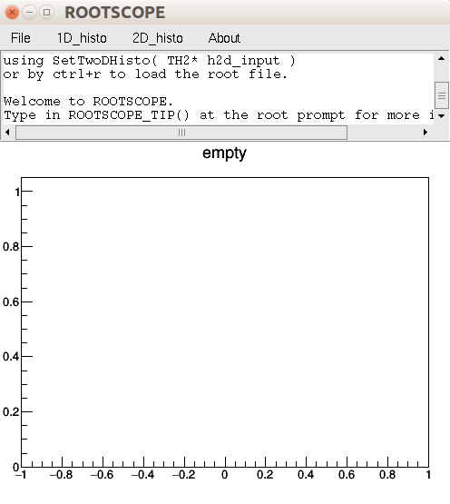 In the root prompt, type in ROOTSCOPE_TIP(). and then it will pop up frequently used hot keys.There are one menu bar, one message box, and a canvas for the display of histograms at the bottom.