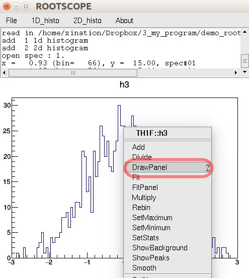 The default ROOT hot keys and right click content menu, etc... are still reserved. For example, right click the histogram will pop up the object-corresponding menu. And you can still use ctrl+s to save to file. One more useful note is that you also can click the histograms, and in the pop-up menu select "DrawPanel".