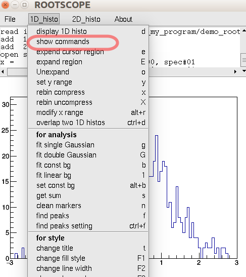 For frequently-used functions, such as Gaussian fit for a peak, there will hot keys for them. For more complicate operation there will be in a dialog form, such as double Gaussian fit. The all hot keys and commands can be found in the drop-down menu. The If you want to change the key binding, it is easy: go to the myROOTSCOPE.C, and search kKey_A (if the original hot key is set to A), and change to whatever you want.